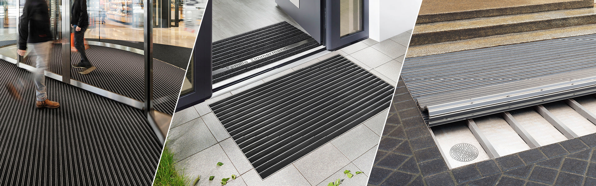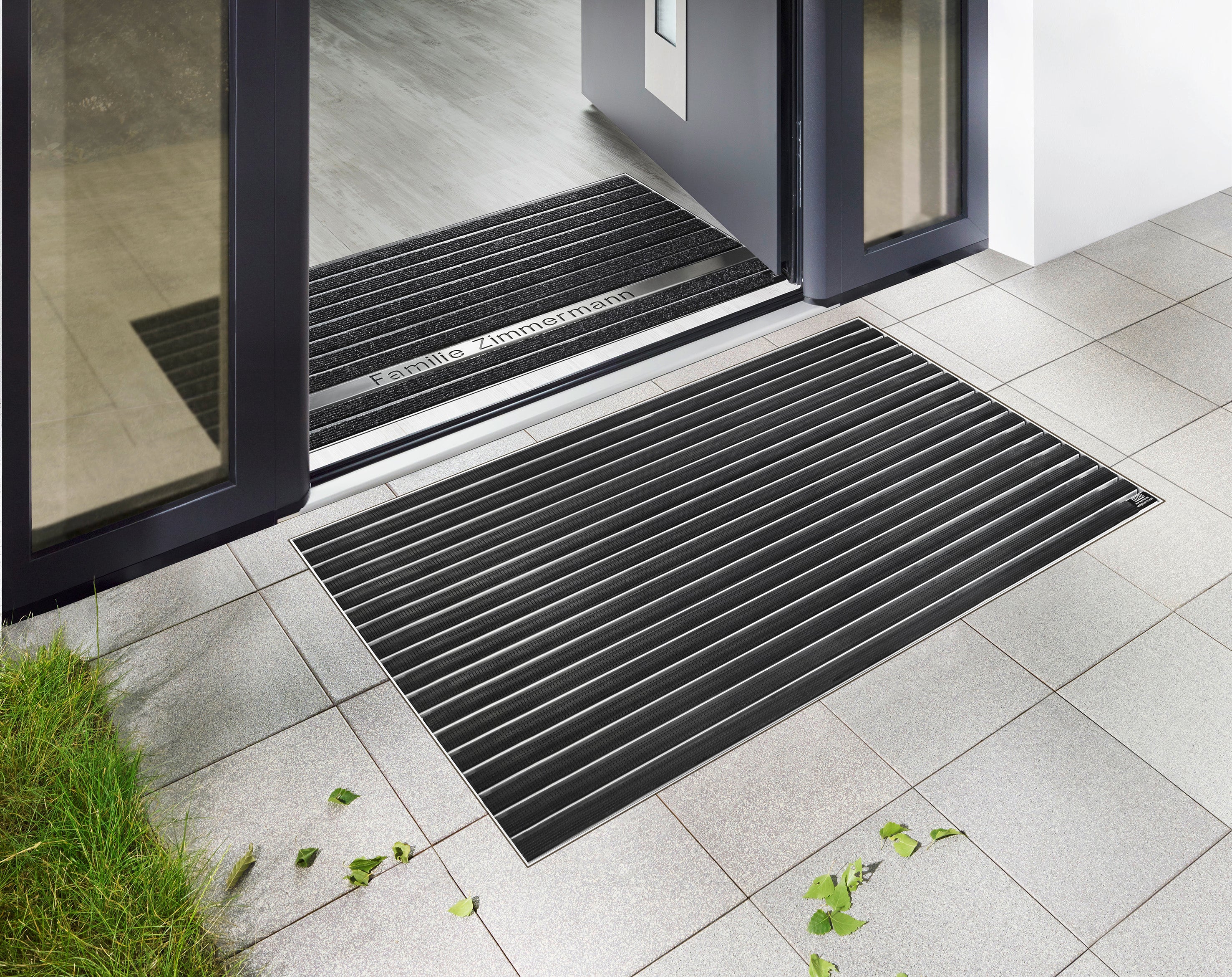 Die Marschall-Serie mit Gummi- oder Bürsteneinlage ist ideal für stark frequentierte Außenbereiche. Unsere Diplomat-Serie kann im überdachten Außenbereich verwendet werden.