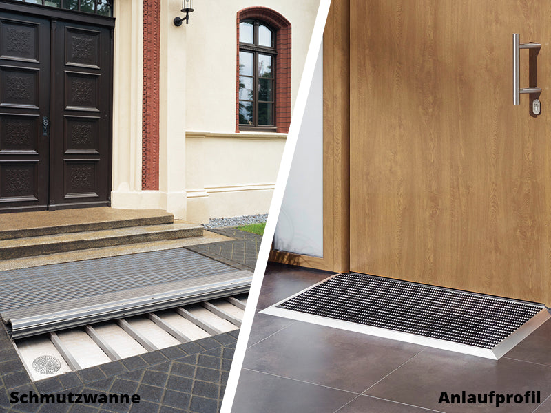 Ergänzen Sie Ihren Schuhabstreifer ganz nach Bedarf: Mit Einbaurahmen für eine saubere Integration in den Boden, Schmutzfangwannen für mehr Aufnahmevolumen, Anlaufprofilen für barrierefreies Begehen oder Abdeckschienen für den perfekten Abschluss.