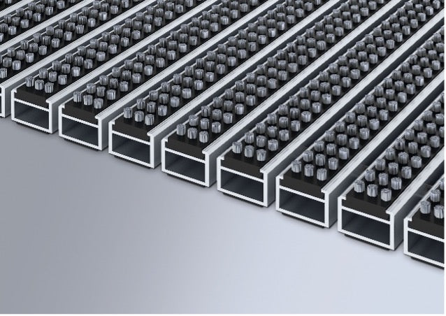 Zu den BürstenproduktenDie äußerst robuste Bürsteneinlage überzeugt mit effektivem Grobschmutzabrieb. Die parallel angeordneten Borstenbündel sind in schwarz oder grau erhällich Tatsächliche Mallenhöhe: + bis 2 mm